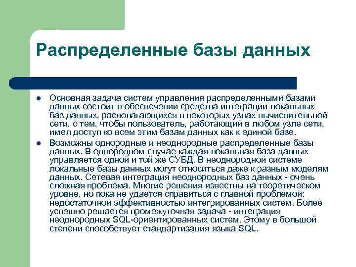 Распределенные базы данных l Основная задача систем управления распределенными базами данных состоит в обеспечении средства интеграции локальных баз данных, располагающихся в некоторых узлах вычислительной сети, с тем, чтобы пользователь, работающий в любом узле сети, имел доступ ко всем этим базам данных как к единой базе. l Возможны однородные и неоднородные распределенные базы данных. В однородном случае каждая локальная база данных управляется одной и той же СУБД. В неоднородной системе локальные базы данных могут относиться даже к разным моделям данных. Сетевая интеграция неоднородных баз данных - очень сложная проблема. Многие решения известны на теоретическом уровне, но пока не удается справиться с главной проблемой: недостаточной эффективностью интегрированных систем. Более успешно решается промежуточная задача - интеграция неоднородных SQL-ориентированных систем. Этому в большой степени способствует стандартизация языка SQL.