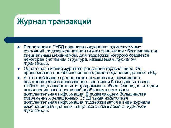 Журнал транзакций l Реализация в СУБД принципа сохранения промежуточных состояний, подтверждения или отката транзакции обеспечивается специальным механизмом, для поддержки которого создается некоторая системная структура, называемая Журналом транзакций. l Однако назначение журнала транзакций гораздо шире. Он предназначен для обеспечения надежного хранения данных в БД. l А это требование предполагает, в частности, возможность восстановления согласованного состояния базы данных после любого рода аппаратных и программных сбоев. Очевидно, что для выполнения восстановлений необходима некоторая дополнительная информация. В подавляющем большинстве современных реляционных СУБД такая избыточная дополнительная информация поддерживается в виде журнала изменений базы данных, чаще всего называемого Журналом транзакций.