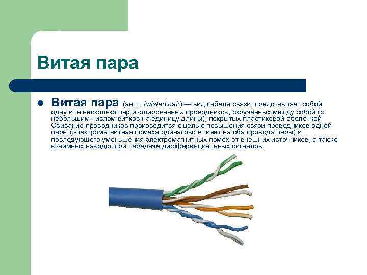 Витая пара l Витая пара (англ. twisted pair) — вид кабеля связи, представляет собой одну или несколько пар изолированных проводников, скрученных между собой (с небольшим числом витков на единицу длины), покрытых пластиковой оболочкой. Свивание проводников производится с целью повышения связи проводников одной пары (электромагнитная помеха одинаково влияет на оба провода пары) и последующего уменьшения электромагнитных помех от внешних источников, а также взаимных наводок при передаче дифференциальных сигналов.