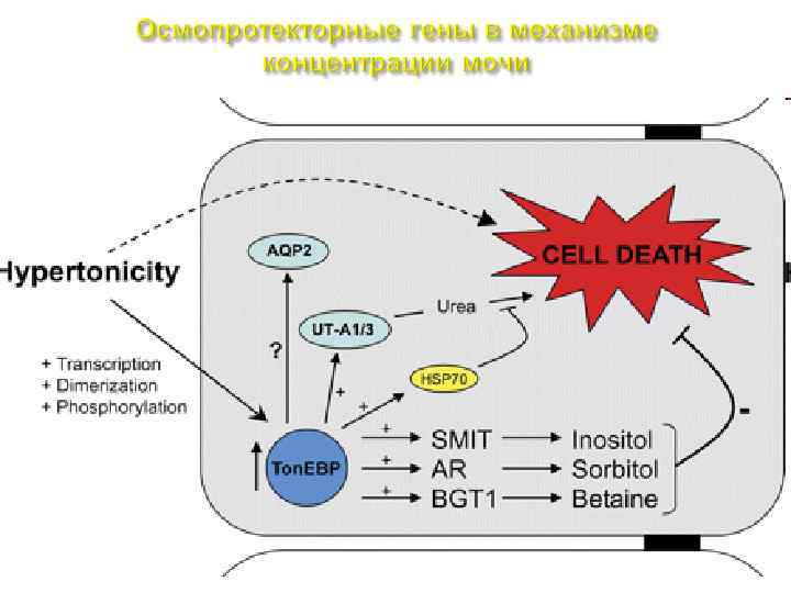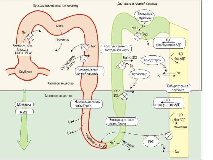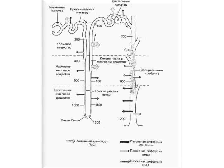 Противоточная модель петли Генле Места активного транспорта Na. Cl через клеточную мембрану нефрона показаны сплошными цветными стрелками. Градиент концентрации соли во внеклеточном пространстве изображен в виде клина серого цвета. Осмотическое движение воды в тканевую жидкость отмечено черными контурными стрелками; пассивная диффузия мочевины - светлыми контурными стрелками.