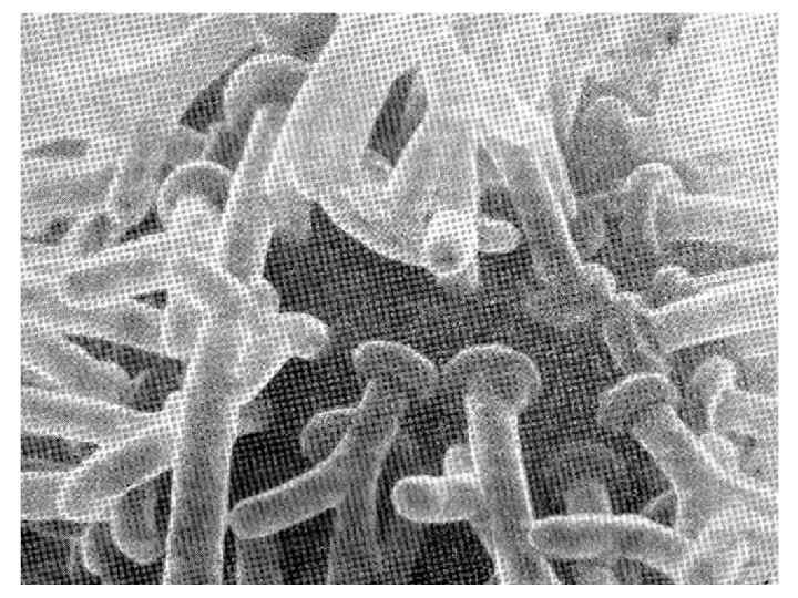 Упрощенная схема выделительной системы насекомого Первичная моча секретируется в просвет мальпигиевых сосудов, а затем переходит в прямую кишку, где она концентрируется за счет удаления воды. Уменьшение объема мочи в прямой кишке вызвано реабсорбцией воды. Стрелками указан путь циркуляции воды и ионов. На рисунке изображены только два мальпигиевых сосуда, хотя на самом деле их множество (Wigglesworth, 1932) Секреторная клетка в стенке мальпигиевого сосуда таракана Поверхность, обращенная в сторону мочи, увеличена за счет тесно прилегающих друг к другу микроворсинок (некоторые ворсинки утолщены из-за присутствия в них митохондрий). На поверхности клеточной мембраны, обращенной в сторону гемолимфы, имеются беспорядочно расположенные в базолатеральном направлении щели, выполняющие важную роль в осмотическом движении жидкости, (Oschman, Berridge, 1971)