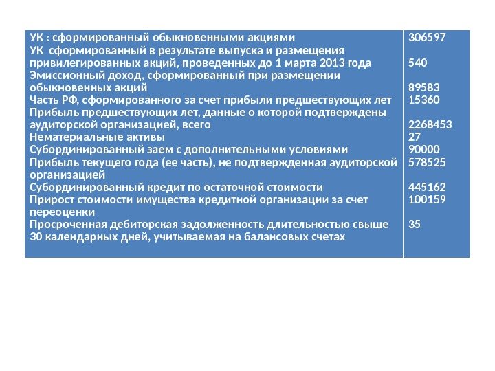 УК : сформированный обыкновенными акциями УК сформированный в результате выпуска и размещения привилегированных акций, проведенных до 1 марта 2013 года Эмиссионный доход, сформированный при размещении обыкновенных акций Часть РФ, сформированного за счет прибыли предшествующих лет Прибыль предшествующих лет, данные о которой подтверждены аудиторской организацией, всего Нематериальные активы Субординированный заем с дополнительными условиями Прибыль текущего года (ее часть), не подтвержденная аудиторской организацией Субординированный кредит по остаточной стоимости Прирост стоимости имущества кредитной организации за счет переоценки Просроченная дебиторская задолженность длительностью свыше 30 календарных дней, учитываемая на балансовых счетах