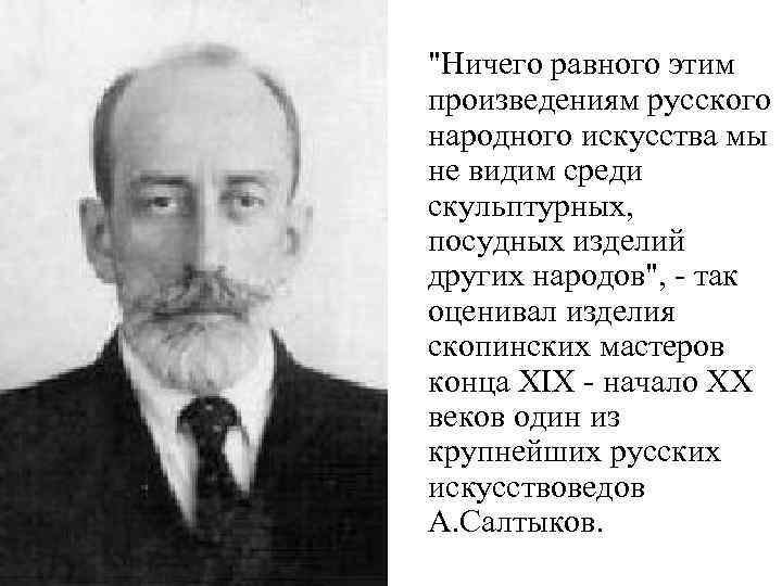 "Ничего равного этим произведениям русского народного искусства мы не видим среди скульптурных, посудных изделий других народов", - так оценивал изделия скопинских мастеров конца XIX - начало XX веков один из крупнейших русских искусствоведов А. Салтыков.