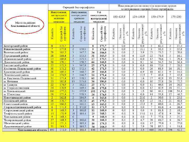 Навчальні заклади Хмельницької області, які мають високі результати з української мови і літератури № пп Навчальний заклад К-сть учасникі в % абітурієнтів, які отримали від 173 до 200 балів 1 НВК "Загальноосвітня школа I-III ступенів, гімназія" м. Славути 22 50, 0 2 Кам'янець-Подільський НВК № 16 у складі загальноосвітньої школи I-III ступенів та колегіуму 18 50, 0 3 Кам'янець-Подільська спеціалізована загальноосвітня школа I-III ступенів № 5 з поглибленим вивченням інформатики 20 45, 0 4 Хмельницький ліцей № 17 110 43, 6 5 Кам'янець-Подільський НВК № 9 ім. А. М. Трояна у складі спеціалізованої ЗШ I-III ст. з поглибленим вивченням англійської мови та школи мистецтв 37 43, 2 6 Хмельницька спеціалізована середня загальноосвітня школа I-III ступенів № 1 32 40, 6 7 Кам'янець-Подільський НВК № 8 в складі гімназії та загальноосвітньої школи I-III ступенів з українською та російською мовами навчання 15 40, 0 8 Кам'янець-Подільський ліцей Хмельницької області 104 39, 4 9 Гімназія № 2 м. Хмельницького 79 39, 2
