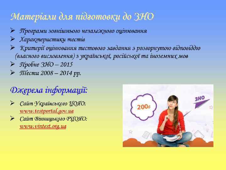 У розділі «Готуємось до ЗНО» розміщено програми ЗНО з навчальних предметів, характеристики тестів