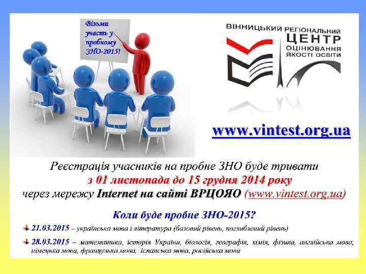 Т УЙ Е ОН ! Е Ф ТА ЬТЕ Л Д ТЕ ХО И ПР www. testportal. gov. ua – сайт Українського центру оцінювання якості освіти (УЦОЯО) www. vintest. org. ua – сайт Вінницького регіонального центру оцінювання якості освіти (ВРЦОЯО) vintest@ukr. net – електронна пошта Вінницького регіонального центру оцінювання якості освіти (0432) 65 65 35 – телефон інформаційної підтримки ВРЦОЯО