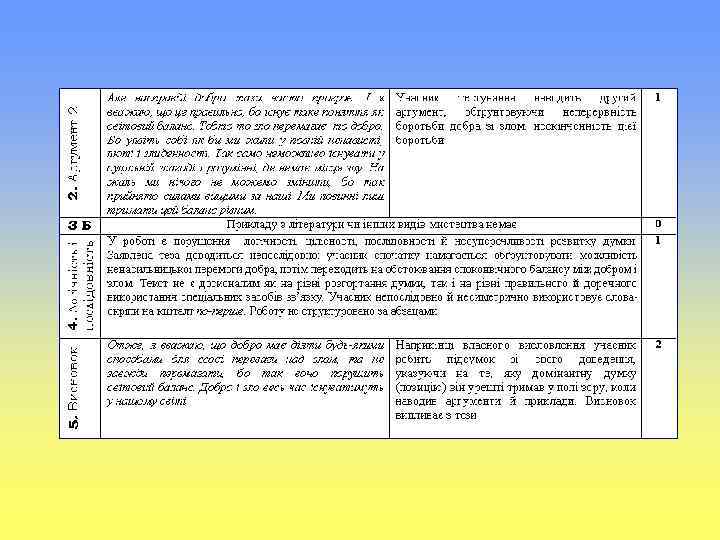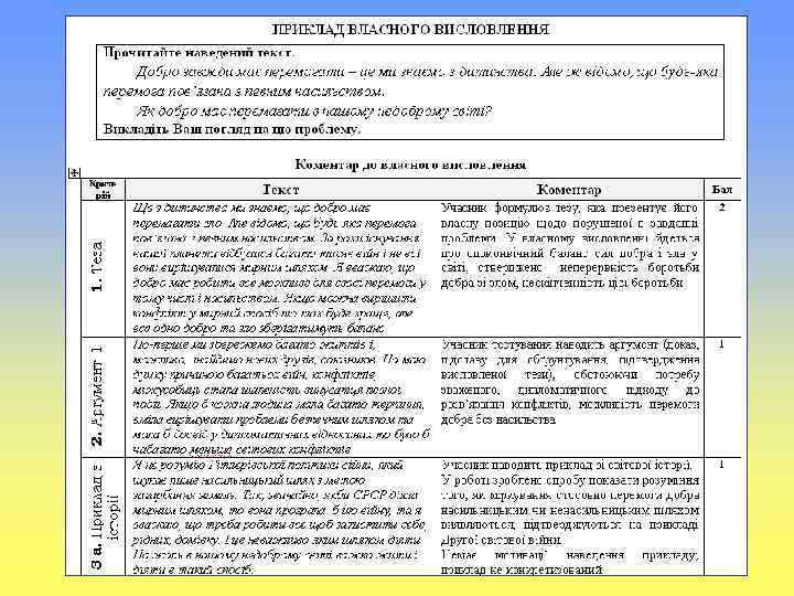 Приклади Аргумент підкріплено, проілюстровано принаймні одним розгорнутим, добре поясненим прикладом з художньої літератури або інших видів мистецтва. Указано проблему, порушену у творі, художній образ, через який проблему розкрито, назву й автора твору. Ілюстрація логічно вписується в розвиток доведення, показуючи розуміння учасником того, як його міркування стосовно шляхів розв’язання певної проблеми виявляються, підтверджуються в творі художня, історична література науковопопулярна література Приклад 1 інші види мистецтва ЗМІ