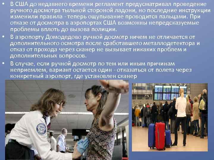 • В США до недавнего времени регламент предусматривал проведение ручного досмотра тыльной стороной ладони, но последние инструкции изменили правила - теперь ощупывание проводится пальцами. При отказе от досмотра в аэропортах США возможны непредсказуемые проблемы вплоть до вызова полиции. • В аэропорту Домодедово ручной досмотр ничем не отличается от дополнительного осмотра после сработавшего металлодетектора и отказ от прохода через сканер не вызывает никаких проблем и дополнительных вопросов. • В случае, если ручной досмотр по тем или иным причинам неприемлем, вариант остается один - отказаться от полета через конкретный аэропорт, где установлен сканер