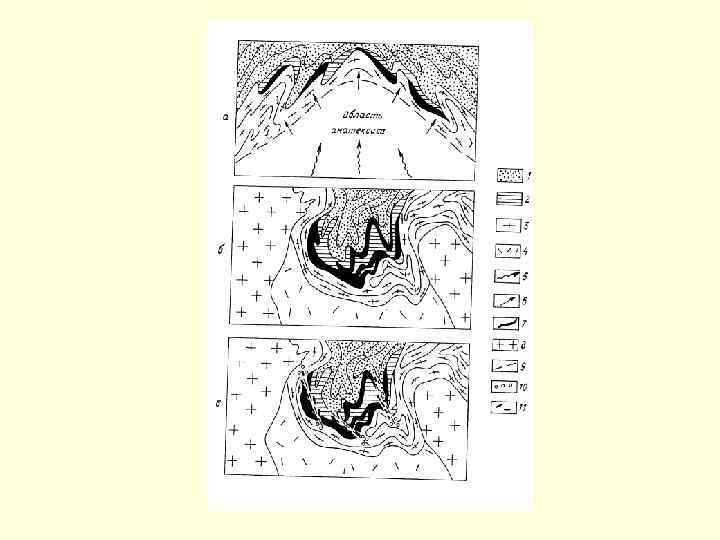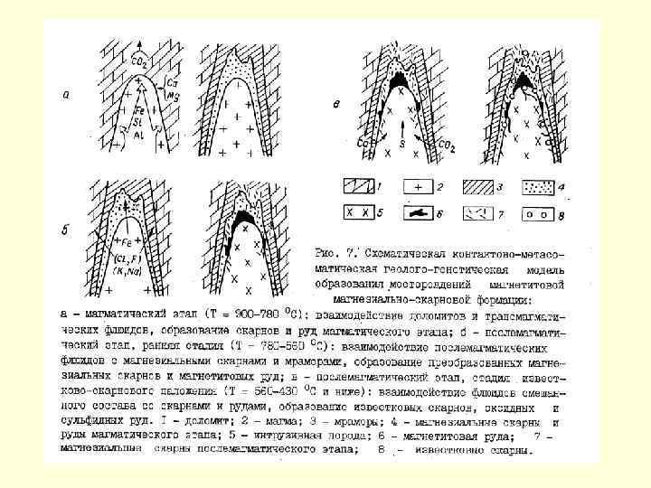 10 8 9 • 6 7 5 4 1 2 3 В протяженной более 3 км по вертикали области рудоотложения выделено 4 группы и 10 разновидностей рудных залежей, образованных в процессе многоэтапного взаимодействия рудообразующих флюидов с вмещающей средой и локализованные на разных уровнях вулканотектонической постройки. В контактах промежуточной магматической камеры на уровне замещенных карбонатно-соленосных отложений развиты конформные и послойные залежи магнезиальноскарновых магнетитовых руд. Среди терригенно-карбонатных отложений палеозоя распространены штокверковые и послойные залежи в магнезиальных и известковых скарнах и скарноидах. В брекчированных участках диатрем и прилегающего пространства преобладают крутопадающие рудные залежи в известковых скарнах. Особый тип представляют жильные и оолитовые руды, образованные в жерле и кратерных озерах над разрушающимися в процессе просадки метасоматическими залежами.