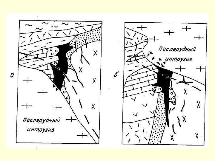 Генетические типы оруденения в скарнах • 1. Тип сопутствующего оруденения, которое непосредственно следует за процессами скарнообразования и происходит в ту же раннюю постмагматическую стадию гидротермального процесса вследствие изменения состава растворов. • 2. Тип наложенного оруденения, которое вызвано наложением на скарны более поздних гидротермальных растворов и происходит вследствие взаимодействия растворов кислотной стадии с основной средой скарнов.