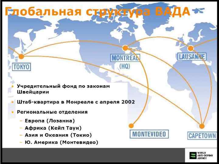 Предотвращение допинга в спорте и борьба с ним: законодательный аспект Международная конвенция о борьбе с допингом в спорте от 19 октября 2005 г. Всемирный антидопинговый кодекс Международные стандарты ВАДА Общероссийские антидопинговые правила ФЗ РФ «О Ратификации Международной Конвенции о борьбе с допингом в спорте» от 27 декабря 2006 г. Федеральный закон от 7 мая 2010 г. N 82 -ФЗ "О внесении изменений в Федеральный закон «О физической культуре и спорте в Российской Федерации» Федеральный закон «О внесении изменений в трудовой кодекс Российской Федерации» от 28 февраля 2008 Приказ Минспорта России от 13. 05. 2009 «Об утверждении порядка проведения допинг-контроля» и т. д.