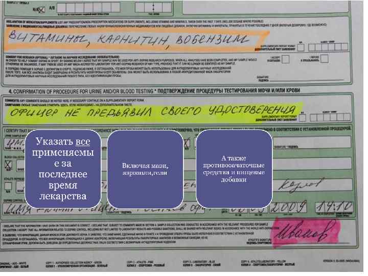 Завершение допинг-контроля Спортсмен получает копию заполненного протокола допингконтроля, а также любых других протоколов, которые использовались во время процедуры. Спортсмену необходимо хранить данную копию не менее 6 недель, на случай, если будет обнаружен неблагоприятный результат анализа.