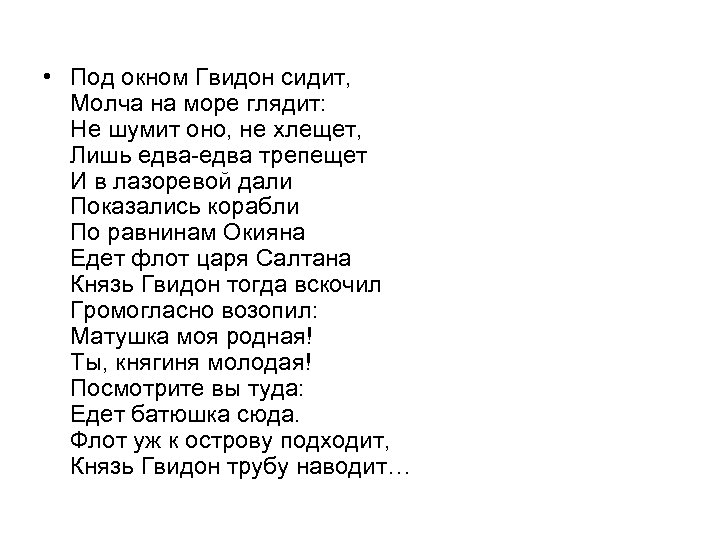 • Под окном Гвидон сидит, Молча на море глядит: Не шумит оно, не хлещет, Лишь едва-едва трепещет И в лазоревой дали Показались корабли По равнинам Окияна Едет флот царя Салтана Князь Гвидон тогда вскочил Громогласно возопил: Матушка моя родная! Ты, княгиня молодая! Посмотрите вы туда: Едет батюшка сюда. Флот уж к острову подходит, Князь Гвидон трубу наводит…