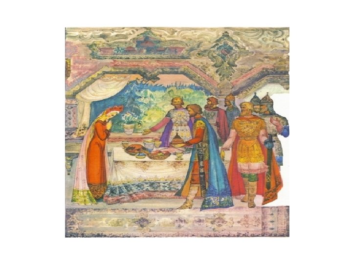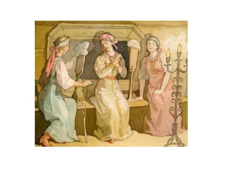 • Дверь тихонько отворилась И царевна очутилась В светлой горнице; Кругом лавки, крытые ковром, Под святыми стол дубовый, Печь с лежанкой изразцовой Видит девица, что тут Люди добрые живут; Знать не будет ей обидно. Никого меж тем не видно Дом царевна обошла, Все порядком убрала, Засветила богу свечку, Затопила жарко печку…