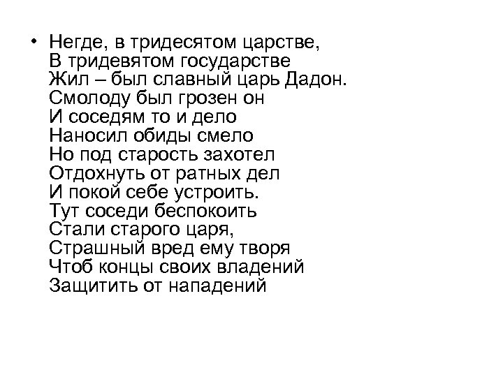 • Негде, в тридесятом царстве, В тридевятом государстве Жил – был славный царь Дадон. Смолоду был грозен он И соседям то и дело Наносил обиды смело Но под старость захотел Отдохнуть от ратных дел И покой себе устроить. Тут соседи беспокоить Стали старого царя, Страшный вред ему творя Чтоб концы своих владений Защитить от нападений