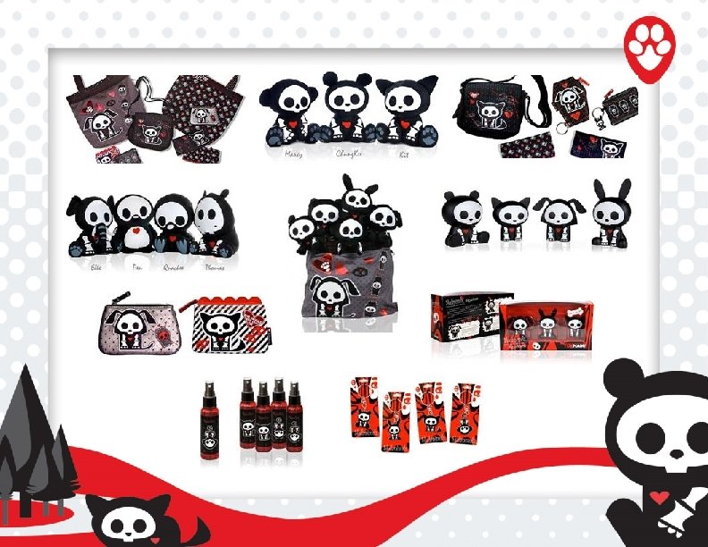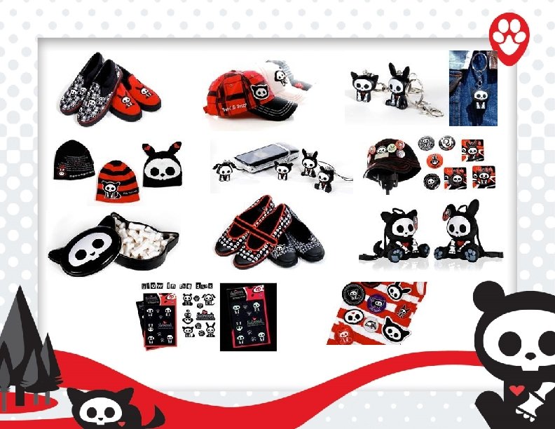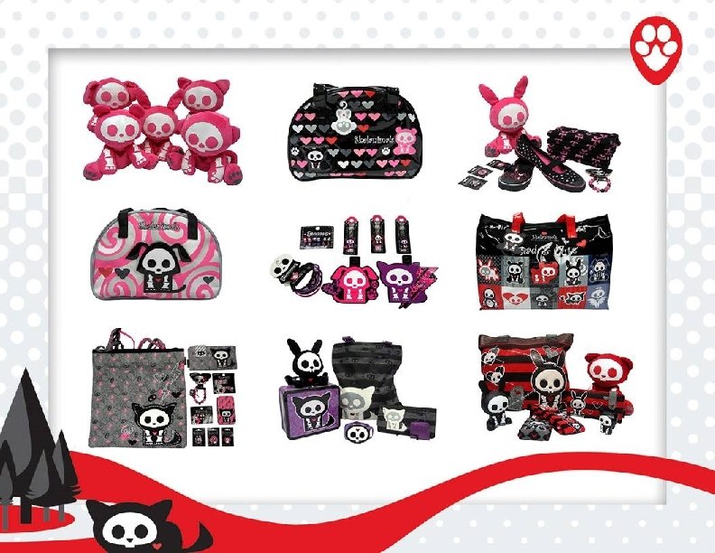 Skelanimals find love in the United States! Skelanimals is positioned in independent specialty boutiques such as Fred Segal, surf & skate stores, Tilly’s, Hastings, Hot Topic, department stores and specialty toy retailers. After only a year and a half on the market Skelanimals is projected to generate $30 million in sales for 2008. Skelanimals is the #1 selling non-music based brand in Hot Topic. Skelanimals boutiques are in all 700 Hot Topic stores and include products such as junior & young men’s apparel, bags, backpacks, wallets, coin purses, shoes, socks, hats, scarves, stickers, buttons, pins, magnets, patches, cell phone charms, zipper pulls, keychains, shoelaces, keycaps, postcards, posters, candy, cosmetics, fragrance, bedding & plush. Young men’s launched in April 2008 with sell throughs up to 71% weekly. FAO Schwarz will roll out Skelanimals boutiques in all stores including Macy’s stores starting in August 2008. Skelanimals will launch it’s tween line in Department Stores and other tween specialty chains for Spring 2009.