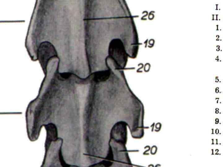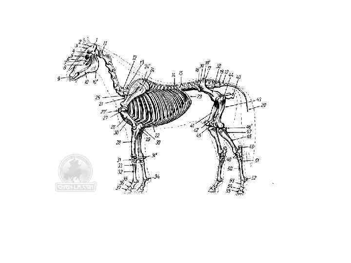 • • 1. Затылочная кость. 2. Теменная кость. 3. Лобная кость. 4 Скуловой отросток. височной кости. 5. Глазная орбита. 6. Скуловая кость. 7. Носовая кость. 8. Верхнечелюстная кость. 9. Межчелюстная или резцовая, кость, 10. Нижняя челюсть. 10’. Угол нижней челюсти. 11. I шейный позвонок (атлант). 12. VII последний шейный позвонок. 13. I грудной позвонок. 14. XVII грудной позвонок. 15. I поясничный позвонок. 16. VI поясничный (последний) позвонок, 17. I крестцовый позвонок. 18. V крестцовый позвонок. 19. I хвостовой позвонок. 20. XVI хвостовой позвонок. 21. I ребро. 22. VI ребро. 23. XVIII ребро. 24 и 24'. Лопатка и хрящ лопатки. 25. Лопаточный гребень. 26. Плечевая кость. 27. Большой бугор плечевой кости. 27'. Передний бугор плечевой кости. 28. Лучевая кость (подплечье). 29. Локтевая кость. 30. Локтевой отросток. 31. Кости запястья. 31'. Добавочная (сесамовидная) кость запястья. 32. Пястная кость. 33. Наружная (грифельная) кость. 34. Сесамовидная кость. 35. I фаланга (путовая кость). 36. II фаланга (венечная кость). 37. III фаланга (копытная кость). 38. Подвздошная кость. 39. Бугор тазовой кости (моклок). 39'. Крестцовый бугор тазовой кости. 40. Бугор седалищной кости. 41 и 42 Бедренные кости. 43. Третий вертел. 44. Большой вертел. 45. Коленная чашка. 46. Большая берцовая кость. 46'. Коленный сустав. 47. Малая берцовая кость голени. 48. Кости заплюсны (скакательный сустав). 49. Отросток ниточной кости. 50. Плюсневая кость. 51. Грифельная кость (наружная). 52. Сесамовидная кость. 53. Путовая кость (первая фаланга). 54. Венечная кость (вторая фаланга). 55. Копытная кость.