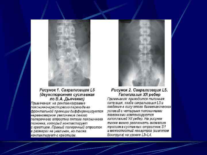 3. Смещение грудно-поясничной границы: - краниальное - при отсутствии последних ребер. - каудальное - развитие обособленных поясничных ребер. 4. Сакрализация V поясничного позвонка уподобление его крестцовым. 5. Люмбализация I крестцового позвонка заключается в его несращении с крестцом, редкая патология. 6. Изменчивость границы между крестцом и копчиком.