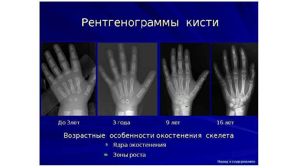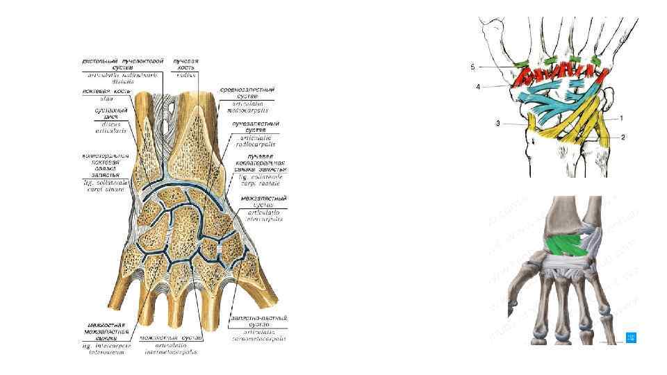 Кости запястья: Проксимальный ряд (начиная от I пальца): ладьевидная кость (os scaphoideum) полулунная кость (os lunatum) трехгранная кость (os triquetrum) гороховидная кость (os pisiforme) Дистальный ряд (начиная от I пальца): многоугольная кость (os multangulum) трапециевидная кость (os trapezoideum) головчатая кость (os capitatum) крючковидная кость (os hamatum)