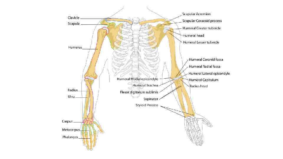 Скелет верхней конечности. Пояс верхней конечности Cingulum membri superioris Ключица (clavicula) лопатка (scapula) Свободная верхняя конечность Membrum superioris libera Плечо (brachium): Плечевая кость (humerus) Предплечье (antebrachium): • Лучевая кость (radius) • Локтевая кость (ulna) Кисть (manus): • Кости запястья (ossa carpi) • Кости пясти (ossa metacarpi) • Кости пальцев кисти (ossa digitorum manus)