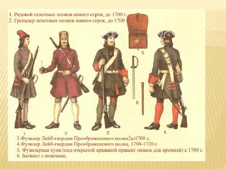 Преображенский полк Первое боевое крещение полк получил в Азовских походах 19651966 годов. В 1698 году полк состоял из четырех батальонов, в каждом батальоне по 4 роты, и того полк имел 16 рот фузилеров (пехота, вооруженная кремниевыми ружьями). Также в состав преображенского полка входили гренадерская рота (отборная пехота вооруженная гранатами и ружьями, использовалась в основном для штурма укреплений) и бомбардирская рота (артиллерийская рота включавшая в себя мортиры или гаубицы). Название лейб-гвардии получил в 1700 году. Полк участвовал во всех крупных сражениях, сначала в Северной войне со Швецией, позже в Прутском походе против Османской Империи, и потом в Персидском походе против Персии. Преображенский и Семеновский полки