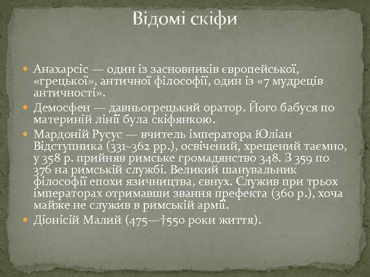 Відомі скіфи Анахарсіс — один із засновників європейської, «грецької» , античної філософії, один із « 7 мудреців античності» . Демосфен — давньогрецький оратор. Його бабуся по материній лінії була скіфянкою. Мардоній Русус — вчитель імператора Юліан Відступника (331– 362 рр. ), освічений, хрещений таємно, у 358 р. прийняв римське громадянство 348. З 359 по 376 на римській службі. Великий шанувальник філософії епохи язичництва, євнух. Служив при трьох імператорах отримавши звання префекта (360 р. ), хоча майже не служив в римській армії. Діонісій Малий (475—† 550 роки життя).
