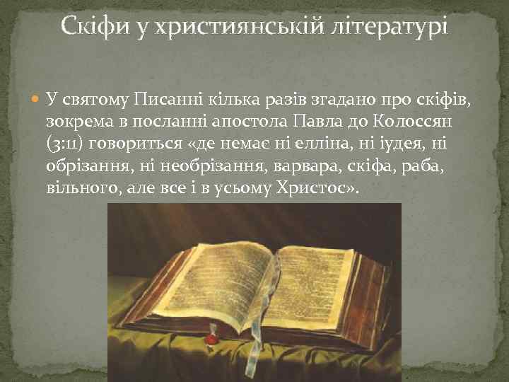 Скіфи у християнській літературі У святому Писанні кілька разів згадано про скіфів, зокрема в посланні апостола Павла до Колоссян (3: 11) говориться «де немає ні елліна, ні іудея, ні обрізання, ні необрізання, варвара, скіфа, раба, вільного, але все і в усьому Христос» .