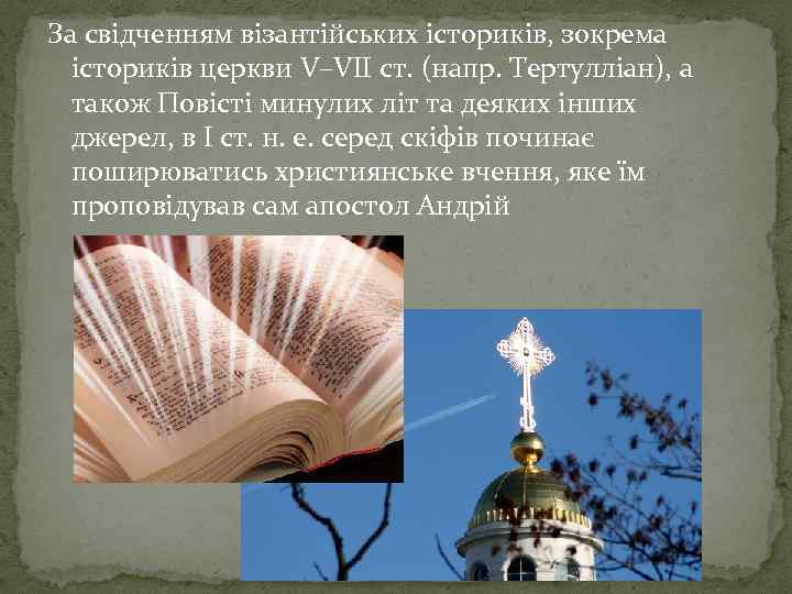 За свідченням візантійських істориків, зокрема істориків церкви V–VII ст. (напр. Тертулліан), а також Повісті минулих літ та деяких інших джерел, в I ст. н. е. серед скіфів починає поширюватись християнське вчення, яке їм проповідував сам апостол Андрій