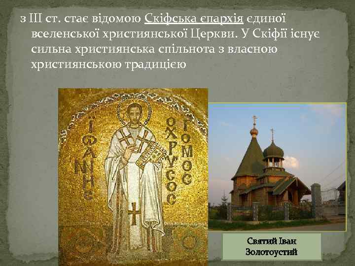 з III ст. стає відомою Скіфська єпархія єдиної вселенської християнської Церкви. У Скіфії існує сильна християнська спільнота з власною християнською традицією Святий Іван Золотоустий