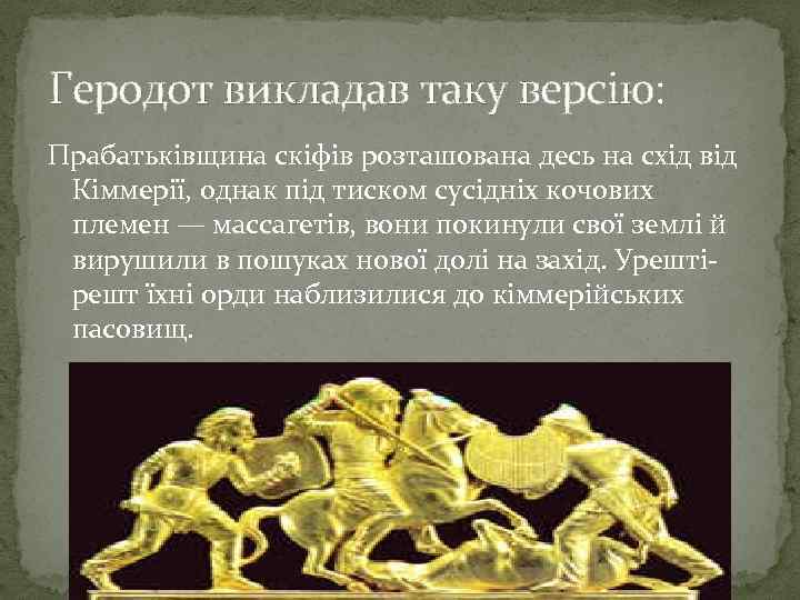 Геродот викладав таку версію: Прабатьківщина скіфів розташована десь на схід від Кіммерії, однак під тиском сусідніх кочових племен — массагетів, вони покинули свої землі й вирушили в пошуках нової долі на захід. Урештірешт їхні орди наблизилися до кіммерійських пасовищ.