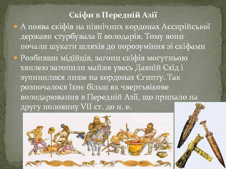 Скіфи в Передній Азії А поява скіфів на північних кордонах Ассирійської держави стурбувала її володарів. Тому вони почали шукати шляхів до порозуміння зі скіфами Розбивши мідійців, загони скіфів могутньою хвилею затопили майже увесь Давній Схід і зупинилися лише на кордонах Єгипту. Так розпочалося їхнє більш як чвертьвікове володарювання в Передній Азії, що припало на другу половину VII ст. до н. е.