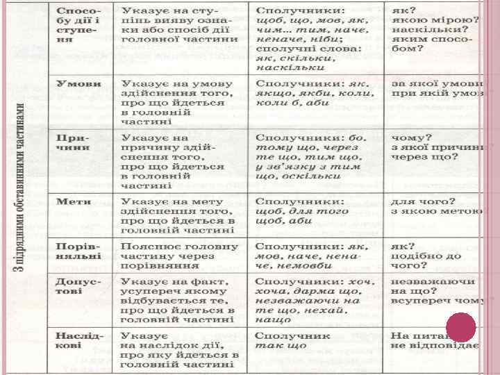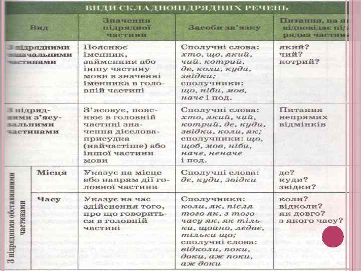 У складнопідрядному реченні одне речення обов’язково головне, друге – залежне, підрядне. Від головного речення ставиться питання, на яке відповідає підрядне. Замість сполучника підрядності часом може бути сполучне слово, що є членом речення (хто, що, який, відколи, навіщо). Види підрядних речень: 1) місця: замінюють і уточнюють обставини місця, відповідають на питання де? куди? звідки? 2) способу дії: замінюють і уточнюють обставини способу дії, відповідають на питання як? яким чином? в якій мірі? 3) часу й умови: вказують на час, коли відбувалася дія головного речення, відповідають на питання коли? відколи? з якого часу? 4) причини і мети: вказують на зумовленість дії головного речення, відповідають на питання чому? через що? навіщо? 5) допустові: повідомляють про умову, за якої відбудеться дія головного речення, відповідають на питання незважаючи на що?