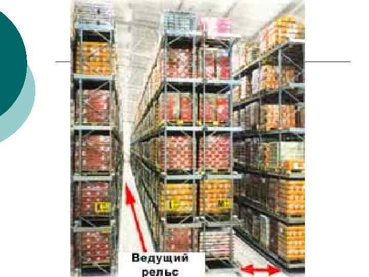 Стеллажно-подвижное хранение ¡ подвижные стеллажи с фиксированным положением ресурсов ¡ неподвижные стеллажи с ресурсами, перемещающимися вдоль полок самопроизвольно (под действием силы тяжести), или принудительно (с помощью различного типа приводов). Повышение эффективности использования площади и объема склада за счет сокращения ширины проходов между стеллажами