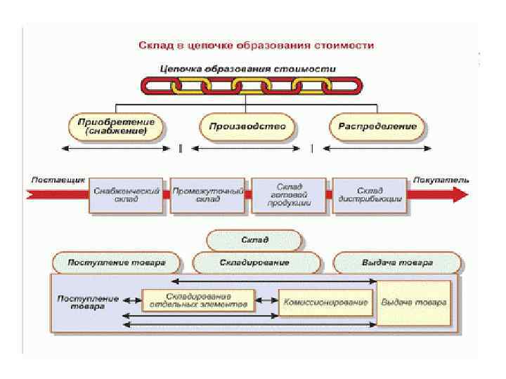 • • • Какой склад, такой и бизнес „Круговорот” финансовых и материальных потоков в одной коммерческой фирме Красные линии означают финансовые потоки, а синие – материальные потоки. То, что в виде финансового потока уходит к поставщикам, возвращается к фирме в виде материальных ценностей (например, товаров) и входит в склад. С другой стороны, все, что уходит к клиентам (выходит из склада), возвращается в фирму как финансовый поток. схема показывает роль склада