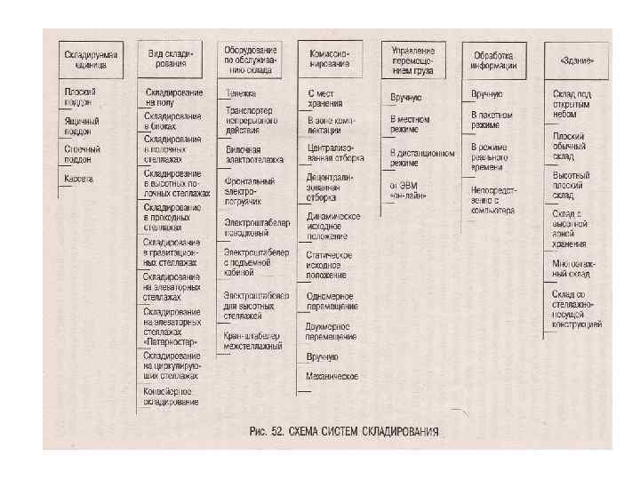 Система складирования включает следующие складские подсистемы • • складируемая грузовая единица; вид складирования; оборудование по обслуживанию склада; система комплектации; управление перемещением груза; обработка информации; "здание" (конструктивные особенности зданий и сооружений). • Каждая подсистема в себя целый ряд возможных элементов (т При этом число элементов, составляющих основные подсистемы, может быть достаточно значительным, а сочетание их в различные комбинации еще более увеличивает многовариантность системы. Это означает, что альтернативный выбор всех конкурентных вариантов должен осуществляться в определенной последовательности с учетом техникоэкономической оценки каждого из них