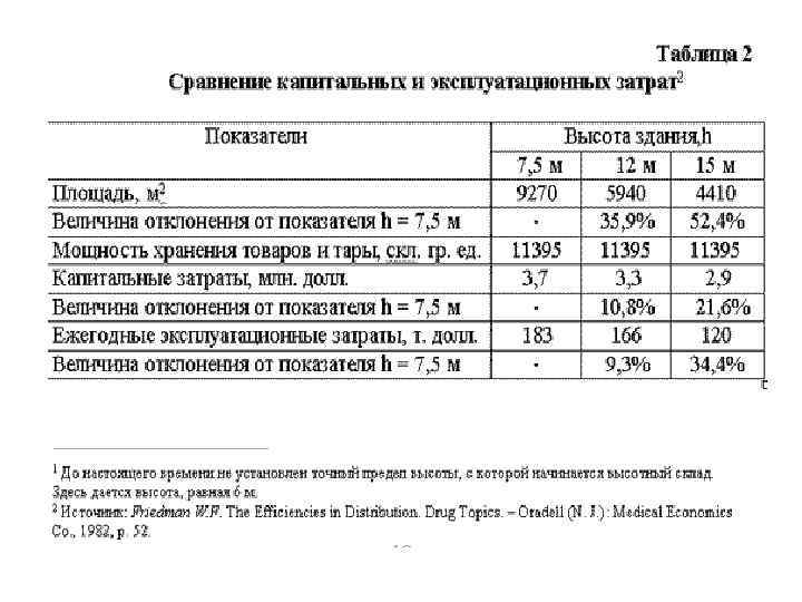 Определение элементов складских подсистем «Здание» • • Склады различаются по виду складских зданий (по конструкции): открытые площадки, полузакрытые (навес) и закрытые. Закрытые являются основным типом складских сооружений, представляя собой обособленное здание со складскими помещениями. Само здание может быть многоэтажным и одноэтажным, при этом последние в зависимости от высоты делятся на обычные (высотой, как правило, 6 м), высотные (высотой свыше 6 м) и смешанные с высотной зоной хранения (высота зоны хранения выше остальных рабочих зон). В современном складском хозяйстве предпочтение отдается одноэтажным складам, а с учетом удорожания стоимости земельных участков и достижений в области складской техники – складам с высотной зоной хранения. Общие затраты на высотный склад меньше в несколько раз, чем затраты на склад с тем же объемом, но с более низкой высотой, что видно из сравнения капитальных и эксплуатационных затрат, приведенных (табл. ). На практике различают следующие основные «типоразмеры» складов: 600; 800; 1000; 1250; 2500; 5000; 7500; 10000; 25000 м 2. При этом, чем больше площадь складского помещения, тем легче и рациональнее может быть размещено технологическое оборудование под хранение груза и использованы технические средства, а значит, имеются возможности для повышения уровня механизации.