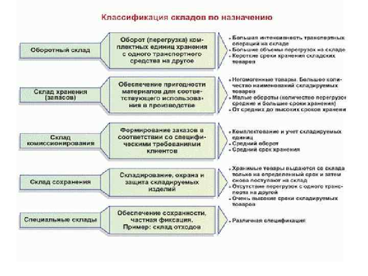Разновидности складов • • • Производственные — склады сырья, комплектующих, материалов, цеховые склады готовых изделий, заводские склады готовой продукции. Транзитно-перевалочные — склады при железнодорожных станциях, портах, речных пристанях, аэропортах, автогрузовых терминалах служат для кратковременного хранения грузов в период перегрузки их с одного вида транспорта на другой. Таможенные — склады для хранения товаров в ожидании таможенной очистки. Досрочного завоза — склады в районах, доставка товаров в которые возможна лишь в опредлённые периоды года. Сезонного хранения — склады для товаров сезонного характера. Резервные — для хранения запасов на случай чрезвычайных обстоятельств. Оптовые распределительные — склады, снабжающие товаропроводящие сети. Коммерческие общего пользования — склады, обслуживающие любых владельцев товаров. Розничные — склады торговых предприятий.