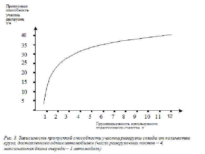 Очевидно, что при увеличении числа постов очередь сокращается. Оптимальным будет такое количество постов когда нет очереди. Пропускная способность погрузочно-разгрузочной зоны зависит не только от числа постов, но и от грузоподъемности поступающего транспорта. Проведенные методом теории массового обслуживания расчеты показывают, что при заданном числе постов, например 4, и при заданном значении очереди на разгрузку, например не более одной машины, количество обрабатываемых на участке грузов прямо пропорционально грузоподъемности обслуживаемого транспорта. Характер зависимости имеет форму кривой, представленной на рис. 3.