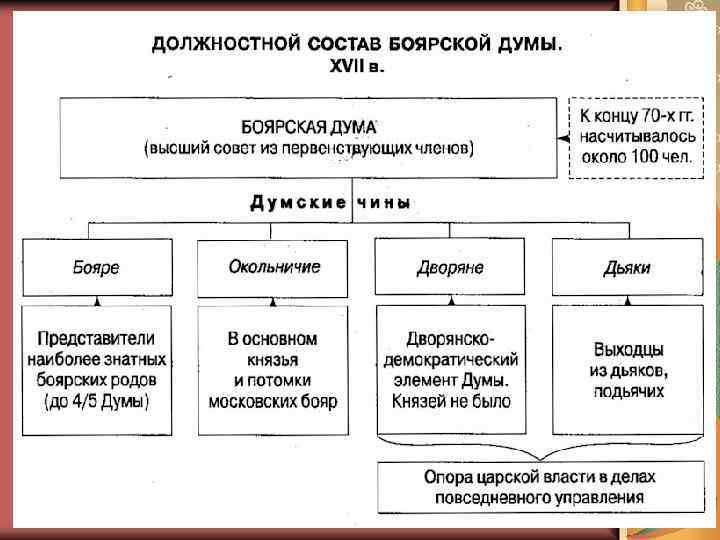В 1619 году, из польского плена возвращается отец Михаила Федоровича митрополит Филарет посчитал, что приоритет во внутренней политики государства надо поставить в сторону укрепления принципов самодержавия. 1. В связи с этим крупные угодия передавались во владения светским и церковным землевладельцам, 2. дворянство за службу получало в награду земли и привилегии, 3. шел процесс закрепления крестьян за их владельцами, путем увеличения срока их сыска, 4. расширялся состав боярской думы, а вот круг лиц имеющих реальную власть наоборот сузился, резко увеличивается число приказов.
