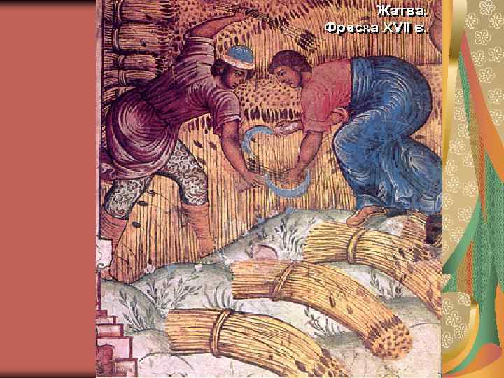 XVII век: сельское хозяйство С прекращением крымских набегов началось освоение Центрально-Черноземного района. Восстановлена площадь обрабатываемых земель после Смуты. Постепенно усиливается связь с рынком. Возникает специализация сельского хозяйства разных районов страны. Рост феодального (в первую очередь, поместного) землевладения. В середине XVII в. оформилось крепостное право (бессрочный сыск беглых крестьян по Соборному уложению 1649 г. ). Помещики могли покупать и продавать крестьян. Крестьяне обязаны были платить помещику оброк и отрабатывать барщину. Черноземье и Поволжье – зерно; новгородские, псковские и смоленские земли – лен; ярославские, нижегородские, казанские области – животноводство…