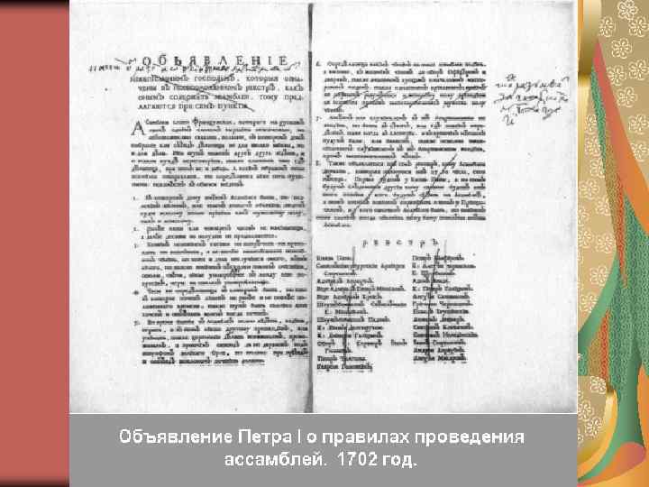 Преобразования в области управления страна была разделена на губернии губернатор обладал судебной, административной, полицейской и финансовой властью вместо Боярской думы был образован Правительствующий Сенат (1711) – высший орган, регулирующий работу всех государственных учреждений приказы были заменены Коллегиями (1717– 1721) учреждение Святейшего Синода (1721) предполагало упразднение патриаршества и подчинение церкви государству в 1721 г. Россия стала империей, а русский царь – императором.