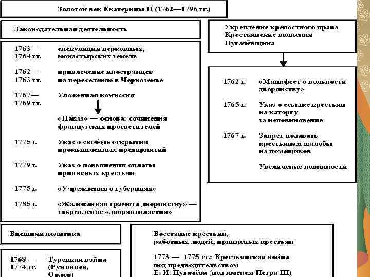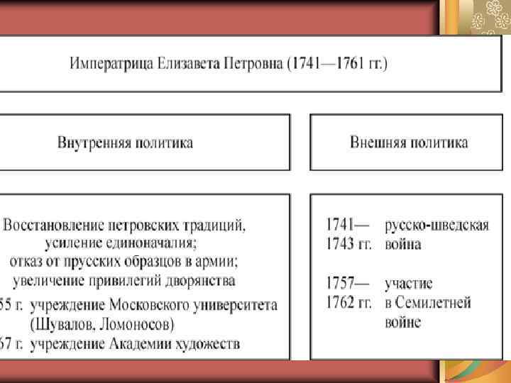 «эпоха дворцовых переворотов» (1725– 1762) Во-первых, инициаторами переворотов выступали различные дворцовые группировки, отражающие борьбу между «новой» и «старой» российской элитой. Во-вторых, движущей силой переворотов была гвардия. В-третьих, следствием переворотов являлось усиление позиций дворянства. В-четвертых, несмотря на застой во всех сферах жизни общества, дворцовые перевороты не привели к отставанию России в целом, что свидетельствует об огромной инерционной силе петровских преобразований.