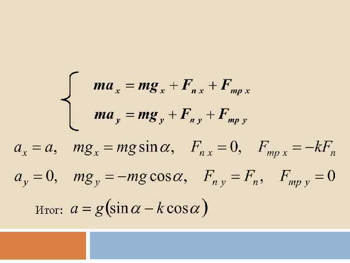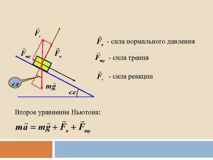 - сила нормального давления - сила трения - сила реакции Второе уравнение Ньютона: