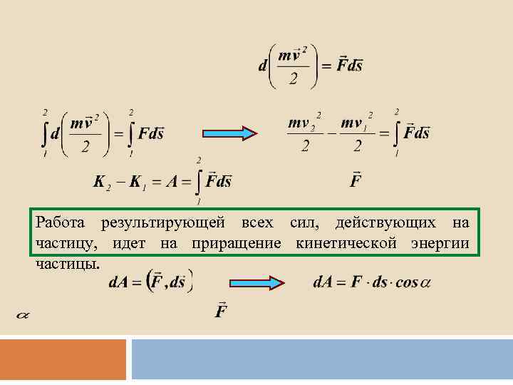 Работа результирующей всех сил, действующих на частицу, идет на приращение кинетической энергии частицы.