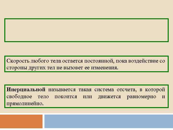 Скорость любого тела остается постоянной, пока воздействие со стороны других тел не вызовет ее изменения. Инерциальной называется такая система отсчета, в которой свободное тело покоится или движется равномерно и прямолинейно.