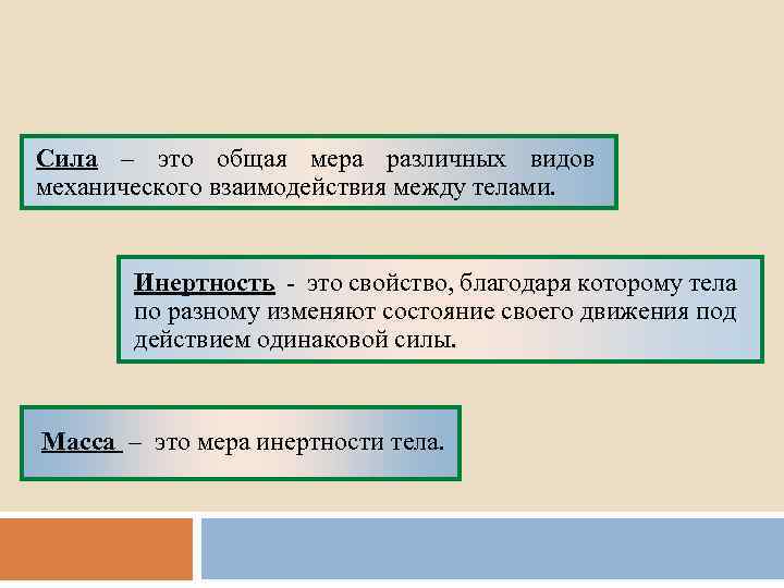 Сила – это общая мера различных видов механического взаимодействия между телами. Инертность - это свойство, благодаря которому тела по разному изменяют состояние своего движения под действием одинаковой силы. Масса – это мера инертности тела.