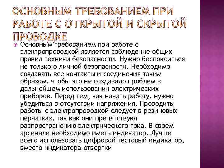 Основным требованием при работе с электропроводкой является соблюдение общих правил техники безопасности. Нужно беспокоиться не только о личной безопасности. Необходимо создавать все контакты и соединения таким образом, чтобы это не создавало проблем в дальнейшем использовании электрических приборов. Перед тем, как начать работу, нужно убедиться в отсутствии напряжения. Проводить работы с электропроводкой следует в резиновых перчатках, так как они препятствуют распространению электрического тока. В своем арсенале необходимо иметь индикатор. Лучше всего использовать цифровой тестовый индикатор, вместо индикатора-отвертки