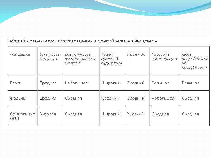 Скрытая реклама в Интернете, в блогах, социальных сетях: создание и наполнение содержанием тематических групп, посвященных Вашей компании и продукции, скрыто формируют мнение о товаре или услуге среди участников). Минусы: репутационный ущерб, меньше контроля, но более эффективно Как правило, чтобы провести кампанию по размещению скрытой рекламы в Сети, нанимают 5– 50 блогеров с «историей» , то есть уже более полугода ведущих онлайн-дневники или пишущих в тематических форумах. Обычно для скрытого продвижения выбираются площадки с посещаемостью более 1000 человек в сутки. При работе с блогерами компании нужно подписать соглашение о конфиденциальности