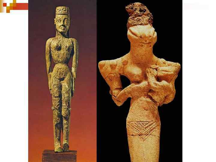 Статуи богов n В эпоху архаики в Греции появились монументальные статуи. n Геометрические вазы-надгробия уступили место грубым «идолам» из дерева, а затем - произведениям из известняка и мрамора, которые первоначально напоминали столбы. n Вплоть до сер. 6 в. до н. э. создавались статуи богов, Ш мало расчлененные, Ш строго фронтальные, Ш словно застывшие в торжественном покое. n Таковы статуи, имевшие религиозномагическое значение и напоминавшие ксоаны гомеровской эпохи.