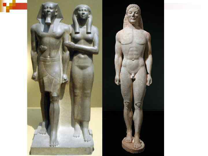 Влияние Египта n Куросы создавались в тот период, когда Греция испытывала культурное влияние Древнего Египта. n Это видно по характерной статичной фронтальной позе, что была свойственна изображениям фараонов. n Греки могли видеть много подобных статуй, посещая Египет в качестве купцов или же наемных солдат.